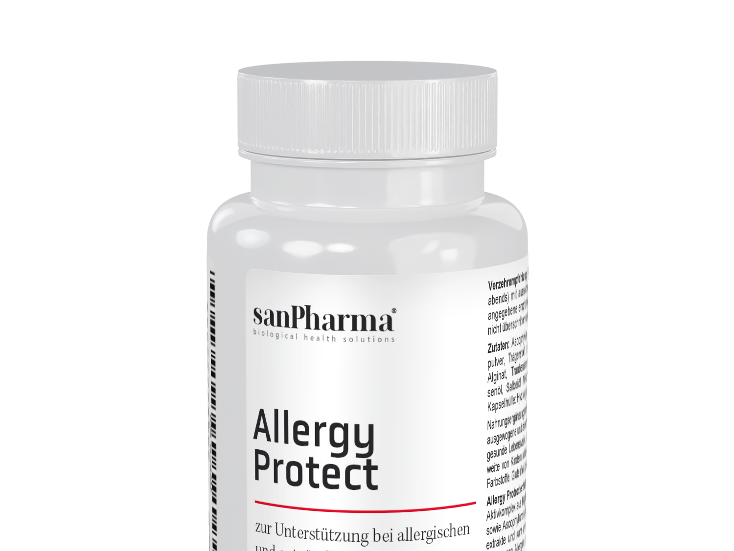 Allergy Protect contains a biophysically optimized active-complex of the antioxidants hop extract (with humulone) and grape seed extract (with oligomeric proanthocyanidins) as well as Ascophyllum nodosum (brown algae) and Ayurvedic herbal extracts. Thanks to its unique combination of ingredients and their anti-inflammatory properties, Allergy Protect can be used to support the treatment of inflammatory diseases, allergies and infections.