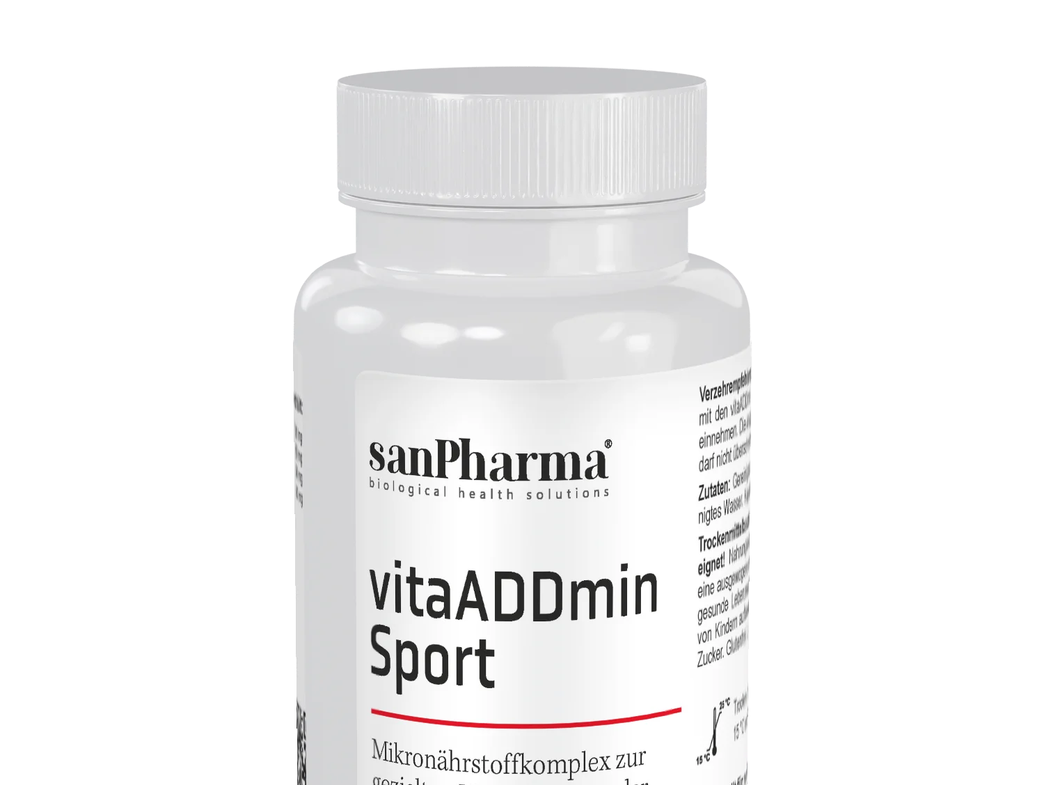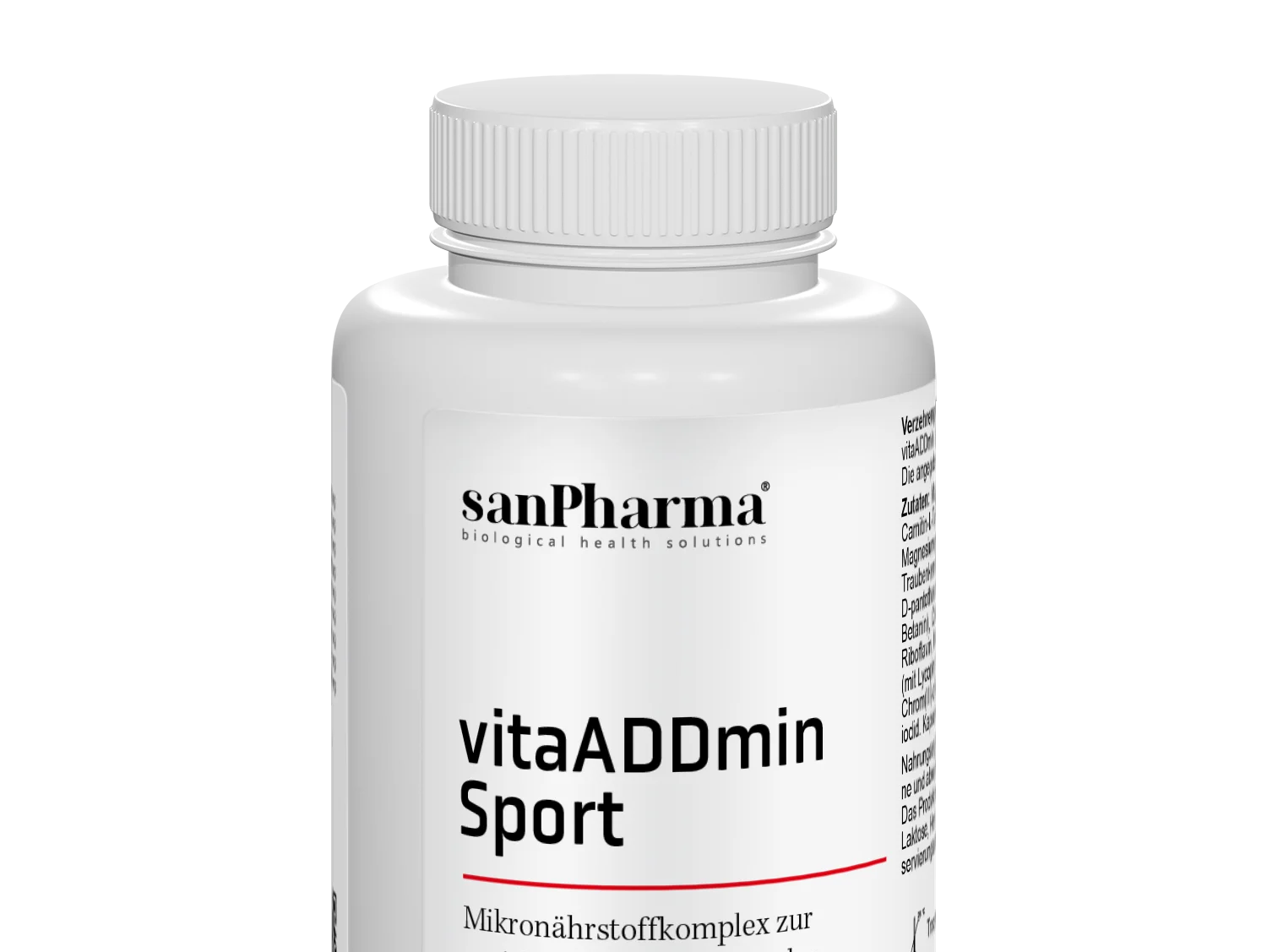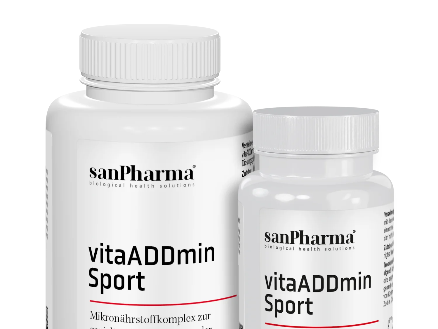 vitaADDmin Sport provides important micronutrients for the targeted support of athletic performance, regeneration and strengthening of the body‘s defenses: